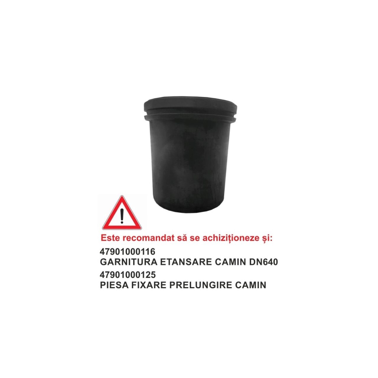 Accesoriile, care se comanda separat, pentru montarea acestei piese sunt: garnitura etansare DN640 cod producator 47901000116 (asigura etansarea intre piesa si rezervor si piesa fixare prelungire camin cod producator 47901000125 (asigura stabilitatea piesei pe rezervor).