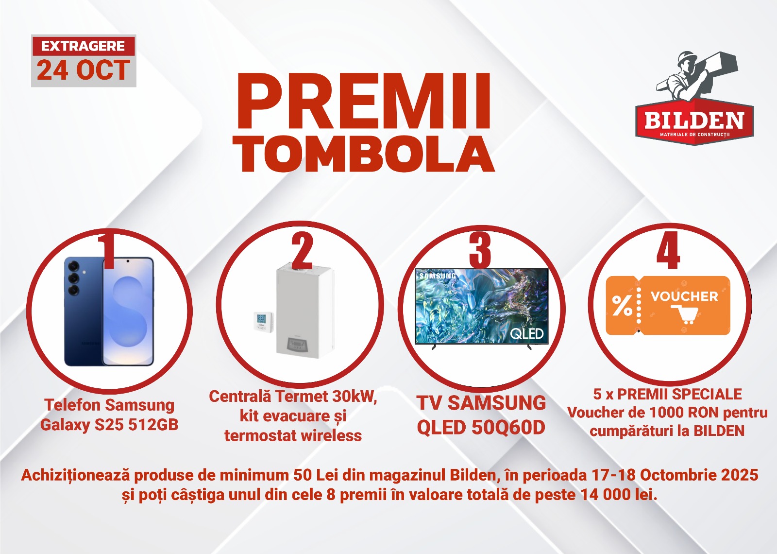 5.1. Campania este adresată numai persoanelor fizice cu domiciliul sau resedința in Romania si care au împlinit vârsta de 18 ani până la data de 17 octombrie 2025, inclusiv, care cunosc și acceptă implicit, integral, în mod expres și neechivoc prevederile prezentului Regulament (denumite în cele ce urmeaza ”Participanți”) și care, în perioada desfasurarii evenimentului vizitează târgul de materiale de construcții „Zilele Porților Deschise” și efectuează cumpărături din magazinul Bilden, în valoare de minim 50 lei (TVA inclus) pe un singur bon fiscal (document de achiziție) completează corect și lizibil cu date reale toate rubricile talonului de participare la tombolă (talonul de tombolă regăsindu-se în anexa nr.1 la prezentul Regulament) și îl depun în urna special amenajată.