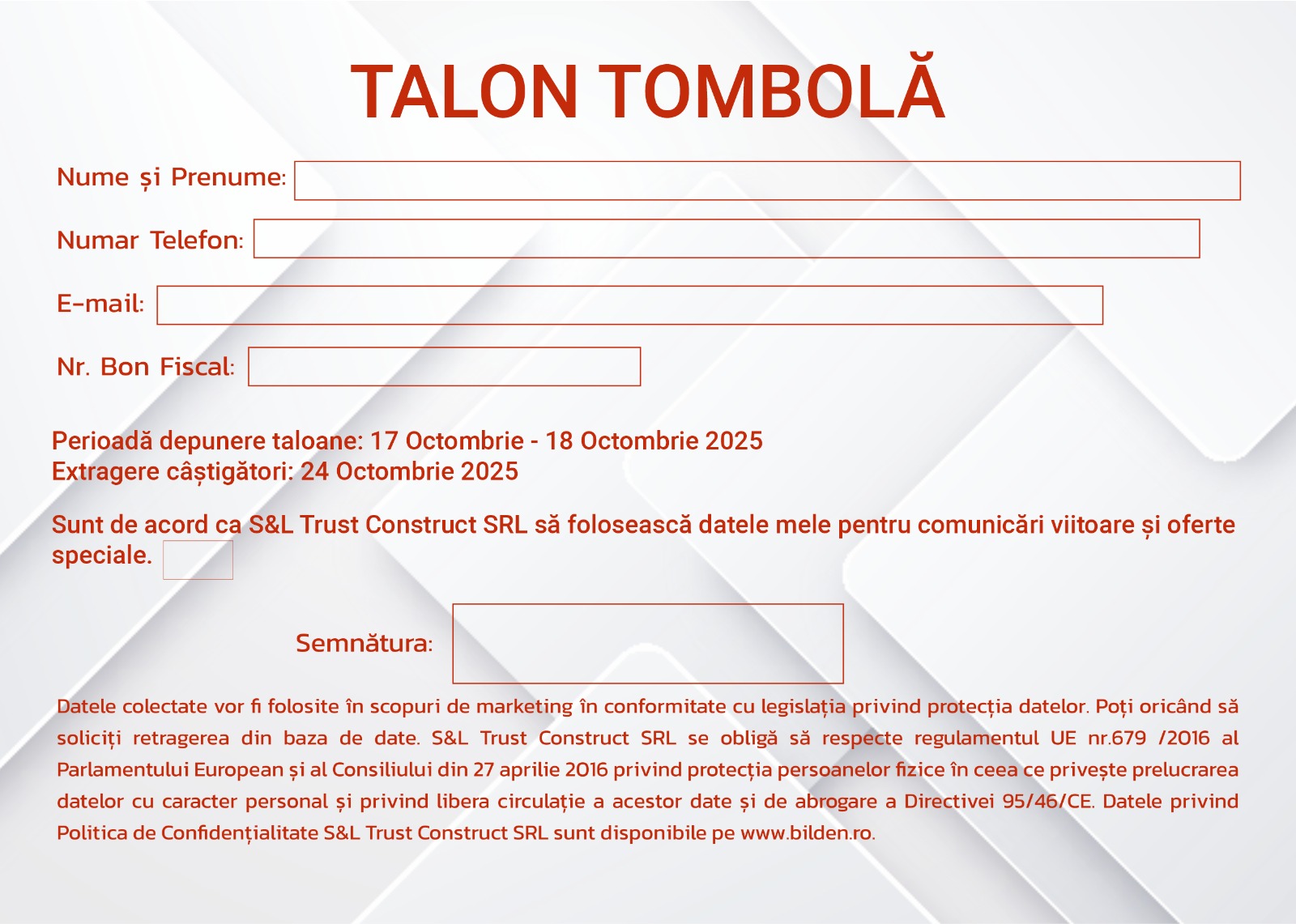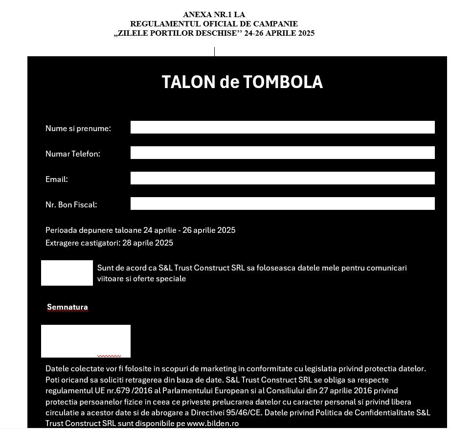 6.1. Vizitatorii târgului de materiale construcții Bilden trebuie să completeze corect și lizibil, cu date reale toate rubricile talonului de tombolă pe care îl primesc de la biroul de informații Bilden din cadrul magazinului. Modelul talonului de tombolă este prezentat în Anexa nr.1 la prezentul Regulament.