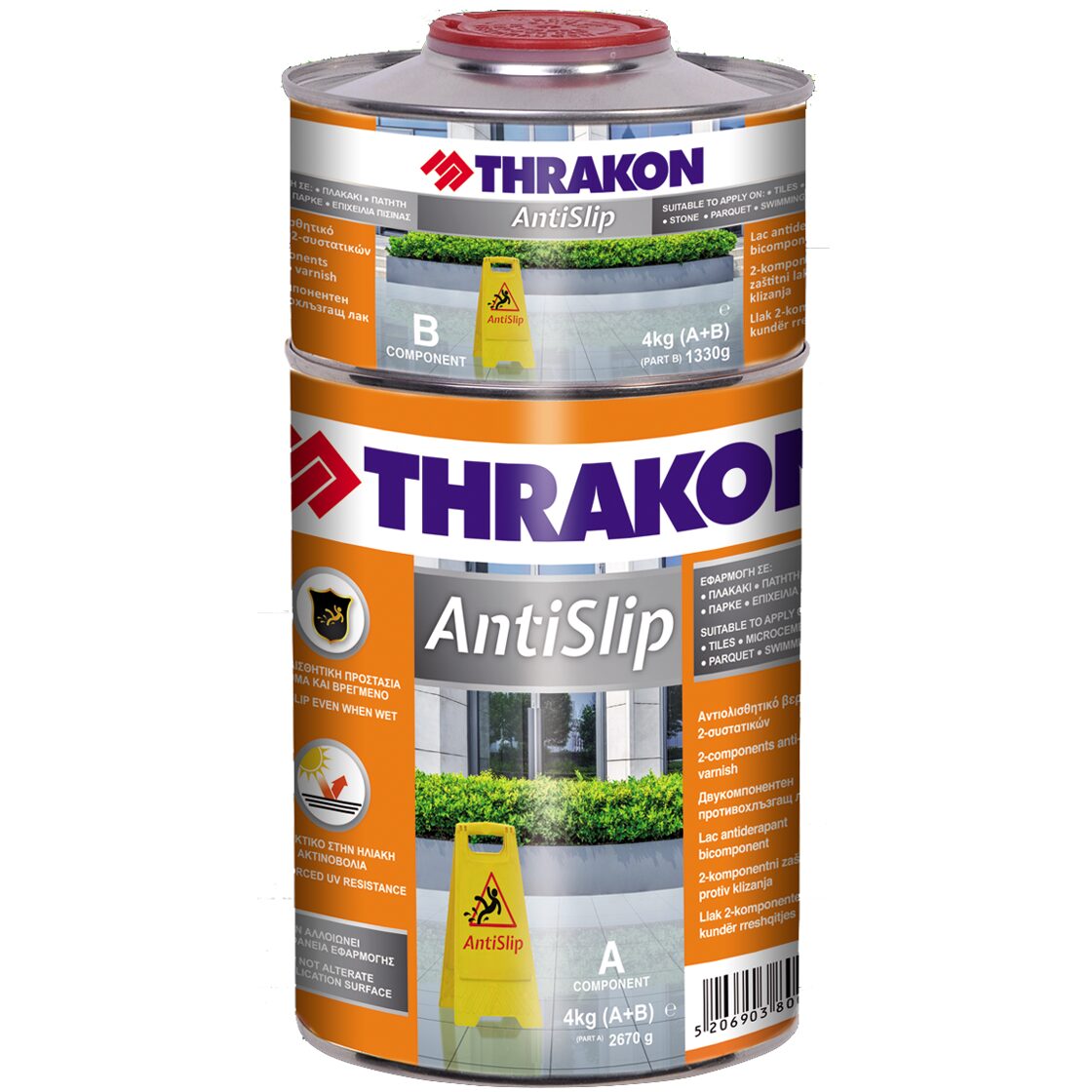 Thrakon Antislip este un lac antiderapant, bicomponent, utilizat pentru sisteme de microcentrare, substraturi pe baza de ciment, lemn, metal, piatra naturala, pentru suprafete cu apa statuta, dusuri, piscine, dale, trepte, scari, balcoane, coridoare, rampe etc.