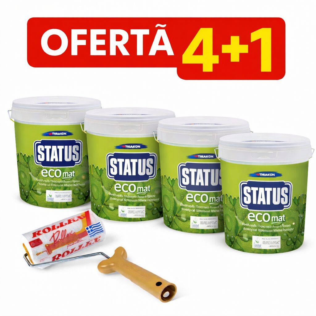 Renovarile mari cer solutii eficiente. Promo Set 4+1 iti ofera tot ce ai nevoie pentru un proiect complet: 4 galeti de Vopsea ultra lavabila ecologica Status Eco 10L si un trafalet profesional din lana naturala Rollex 24 cm cu maner inclus, GRATUIT.