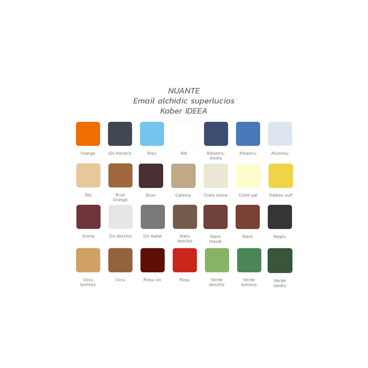 - Nuante disponibile: orange, gri antracit, bleu, alb, crem ivoire, crem pal, cafeniu, bej, ocru luminos, ocru, brun orange, brun, maro deschis, maro, maro roscat, grena, rosu vin, rosu, gri deschis, gri metal, negru, aluminiu, albastru, albastru mediu, galben, verde deschis, verde luminos, verde mediu.