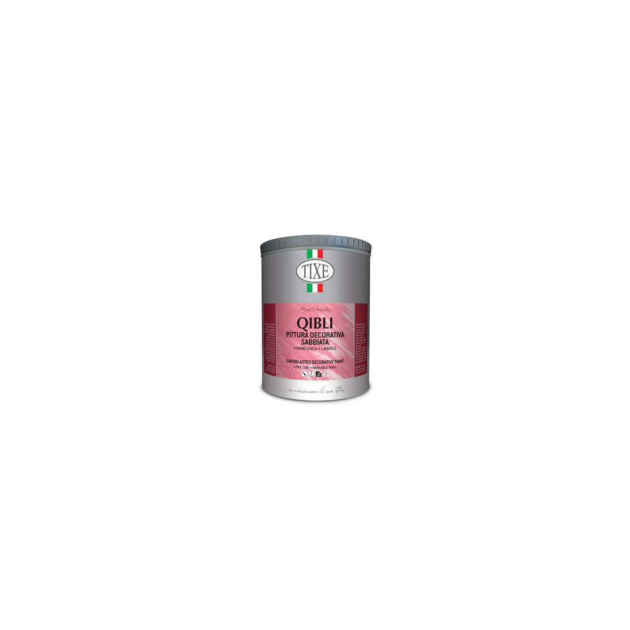 Vopsea decorativa, Qibli, baza argento, 2l_624801 pe bază de apă format din nisipuri și pulberi de bronz pentru a reproduce efectul real metalic sablat chiar și pe suprafețe mari, oferind suportului aspectul celor mai prețioase metale. Permite obținerea unor finisaje decorative splendide, potrivite atât pentru mediile de design clasice, cât și cele moderne.